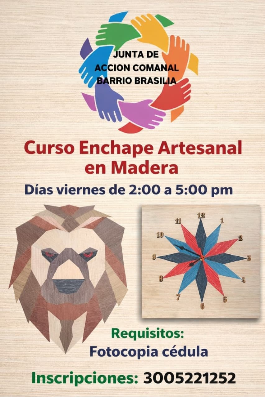 🤔 ¿Te gustaría aprender una técnica artesanal única y fortalecer tus habilidades para el emprendimiento? La Junta de Acción Comunal del Barrio Brasilia invita a toda la comunidad a participar en el curso de Enchape Artesanal en Madera.