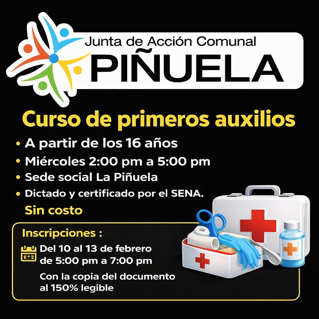 🚑La Junta de Acción Comunal La Piñuela invita a la comunidad a participar en el Curso de Primeros Auxilios, un espacio de formación dirigido a personas a partir de los 16 años, orientado a fortalecer los conocimientos y habilidades necesarias para actuar de manera adecuada ante situaciones de emergencia.