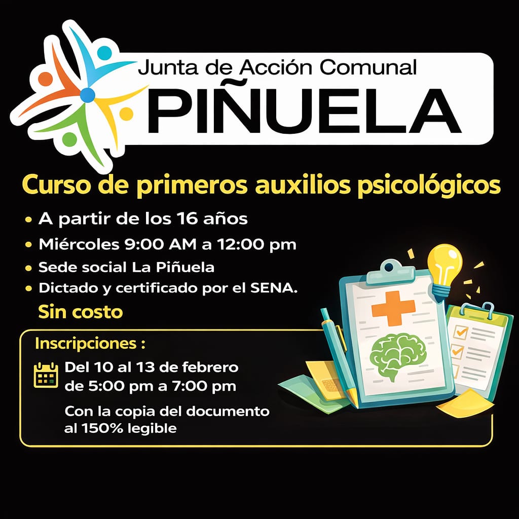 🧠La Junta de Acción Comunal La Piñuela invita a la comunidad a participar en el Curso de Primeros Auxilios Psicológicos, un espacio formativo dirigido a personas a partir de los 16 años, orientado a fortalecer habilidades de escucha, orientación y apoyo emocional ante situaciones de dificultad.