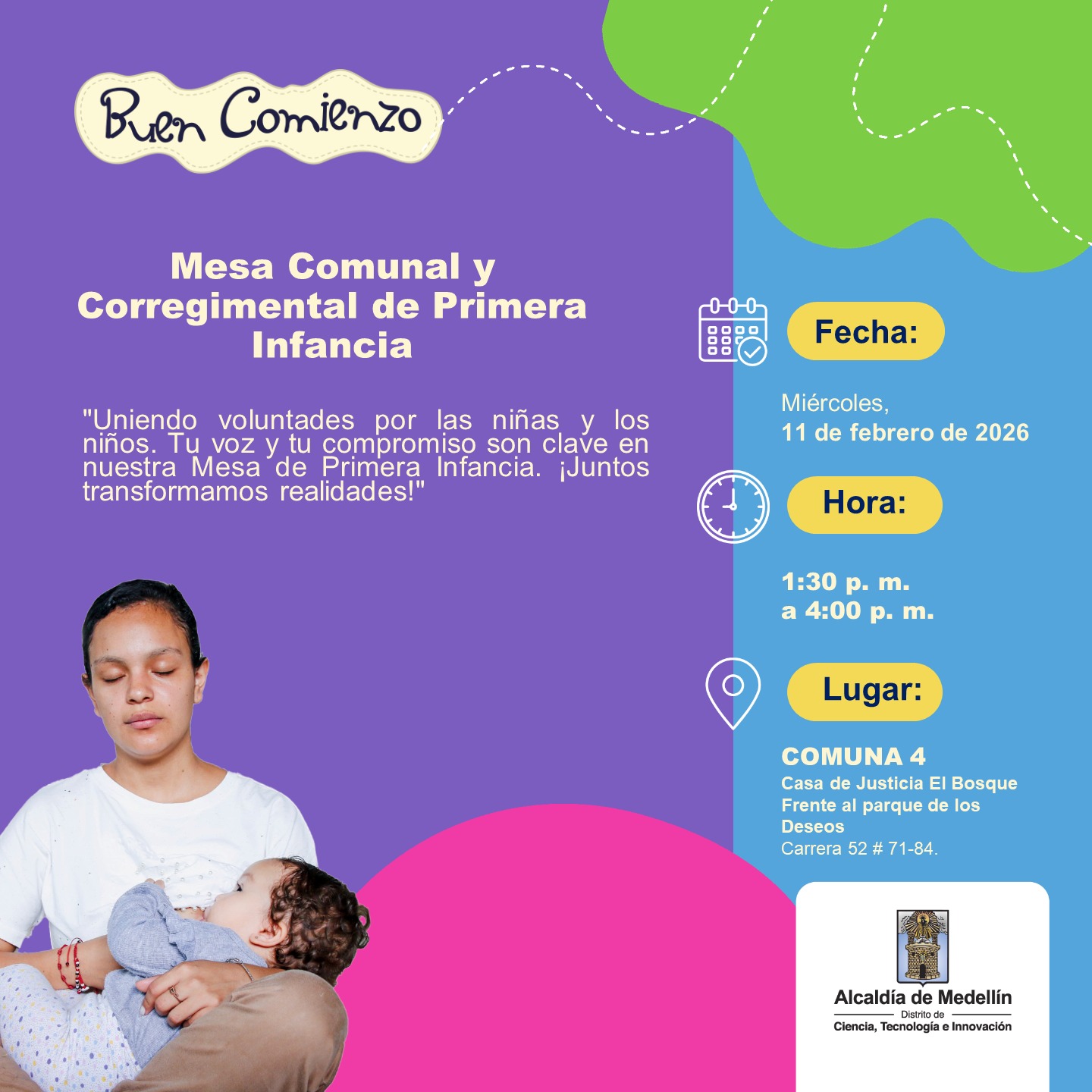 🌈 Bajo el mensaje “Uniendo voluntades por las niñas y los niños. Tu voz y tu compromiso son clave en nuestra Mesa de Primera Infancia”, La Mesa Comunal y Corregimental de Primera Infancia invita a la comunidad a participar en este espacio de diálogo, articulación y compromiso colectivo, orientado a fortalecer las acciones en favor de las niñas y los niños.