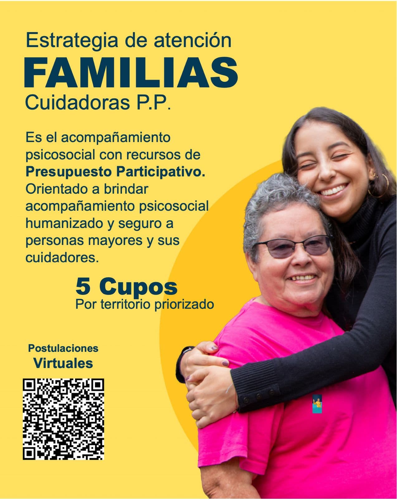 ¡Atención, cuidadores y personas mayores! Les compartimos información de interés para el bienestar de nuestras familias. Ya están abiertas las postulaciones virtuales para la estrategia de acompañamiento psicosocial, financiada con recursos de Presupuesto Participativo.