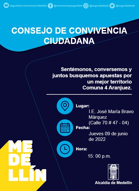 Si vives en la comuna 4 – Aranjuez anímate a participar del Consejo de Convivencia Ciudadana donde podrás compartir tus ideas y propuestas en búsqueda de un mejor territorio.