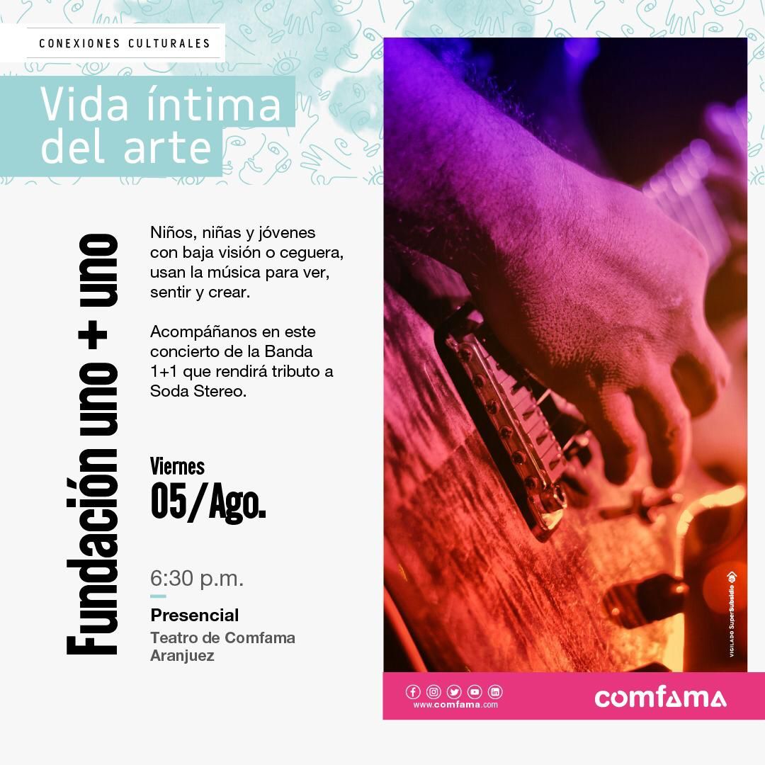 El Centro Cultural Comfama Aranjuez invita a los habitantes del sector a disfrutar del evento “Vida Íntima con el Arte: Fundación Uno + Uno”, donde verán el talento de niños, niñas y adolescentes que a través de la vibración de las ondas musicales encuentran una conexión profunda con el arte y una alternativa para la creación y el disfrute, como personas de baja visión y ceguera.