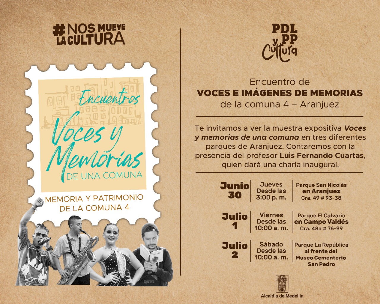 La Mesa de la Cultura invita a la comunidad en general a participar de la muestra expositiva Voces y memorias en una comuna, donde el maestro Luis Fernando Cuartas, dará una charla inaugural hablando un poco de la historias de esta Comuna.