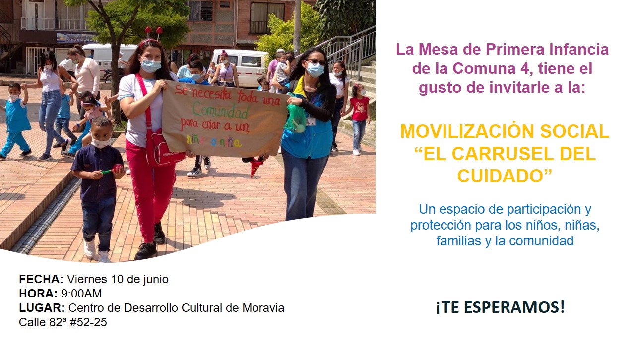 La Mesa de Primera Infancia de la Comuna 4- Aranjuez invita a la comunidad a participar en la movilización social “El Carrusel del Cuidado”, que es un espacio de participación y protección para niños, niñas y las familias.