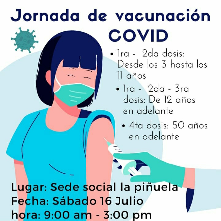 La Junta de Acción Comunal La Piñuela invitan a los habitantes del sector a asistir a la “Jornada de Vacunación contra el Covid-19”, donde estarán colocando primera y segunda dosis para los niños. También se estará aplicando la cuarta dosis a las personas mayores de 50 años.