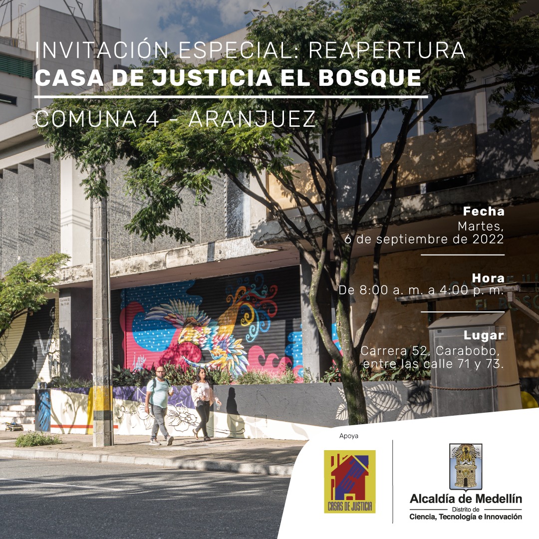 La Administración Municipal invita a la comunidad en general a la reapertura de la “Casa Justicia el Bosque”, la cual trae una variedad de servicios para la población como Personería de Medellín, Unidad de Víctima, migración, Comisaría de Familia, Centro de Equidad de Género, Secretaría de Salud, entre otros servicios.